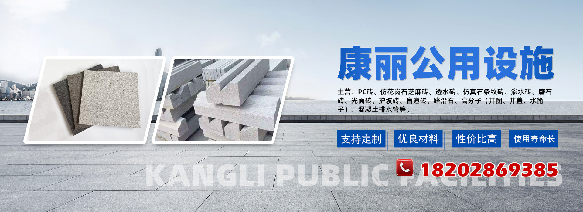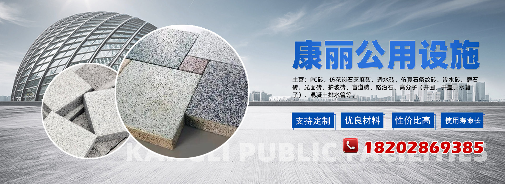 产品包括:PC砖、仿花岗石芝麻砖、透水砖、仿真石条纹砖、渗水砖、磨石砖、光面砖、盲道砖、路沿石、高分子(井圈、井盖、水篦子)、混凝土排水管、护坡砖等。